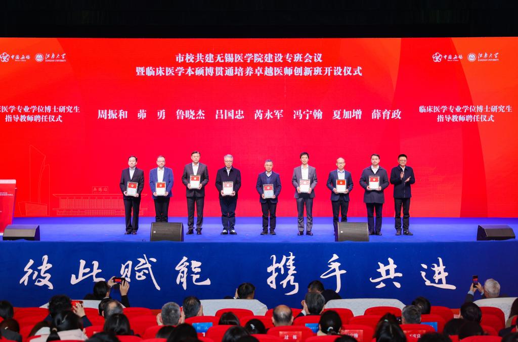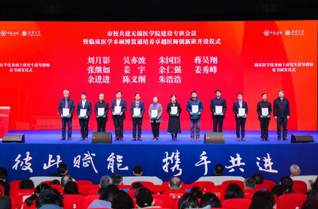 无锡市政府副市长秦咏薪为临床医学专业学位博士研究生指导教师颁发聘书,无锡市发展和改革委员会党组书记、主任曹文彬为优秀硕士研究生指导教师颁发证书,无锡市教育局局长宋新春和无锡市卫生健康委员会党委书记、主任笪学荣为临床医学优秀本科带教教师颁发证书。