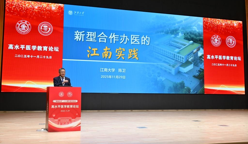 陈卫以“新型合作办医的江南实践”为题作专题汇报。他详细介绍了无锡市和江南大学选择合作办医的初衷和需求,经历十余年的发展,在无锡市委市政府政策和经费保障下,学校通过“医学学科特区”、职称评审“医学通道”等创新举措,助力九博国际