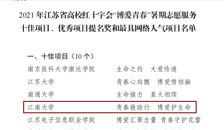 “青春救助行,博爱护生命”志愿服务项目以优异的成绩在58所高校集中展示的60个比赛项目中脱颖而出,第七次获得江苏省十佳项目荣誉!