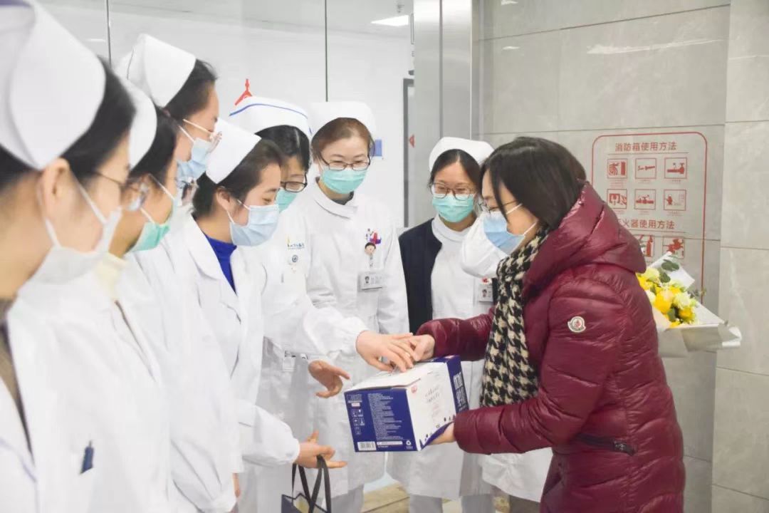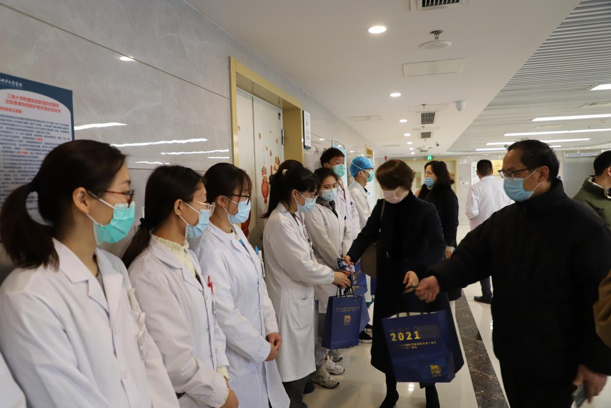 基础医学系系主任吴国胜,护理系系主任蒋玉宇,公共卫生系系主任吴郁,临床1701班班主任邬敏辰,以及研究生秘书、班主任、辅导员老师们来到附属医院,看望和慰问寒假实习学生,了解他们实习期间学习和工作情况,叮嘱他们在完成临床学习的同时要做好自我防护,同时为实习学生送上牛奶、零食礼包等慰问品,给临床带教老师送上鲜花和祝福。