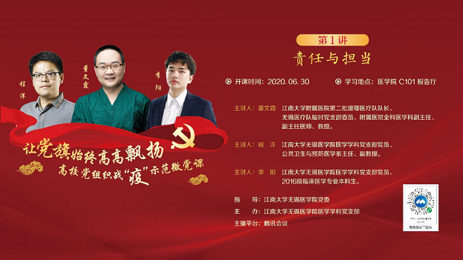 随后,支部“让党旗始终高高飘扬,高校党组织战‘疫‘微党课”第一讲“责任与担当”正式开讲。第一位讲授者是江南大学附属医院第二批援鄂医疗队队长董文霞教授,董教授首先讲述了自己和队员在援鄂抗疫时整建制接管一个重症病区,期间对患者生命健康用心守护,对医疗队员的防护安全严谨监督的感人事迹,体现了新时代背景下医者的责任与担当;第二位讲授者是九博国际