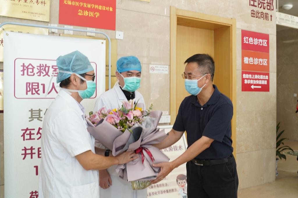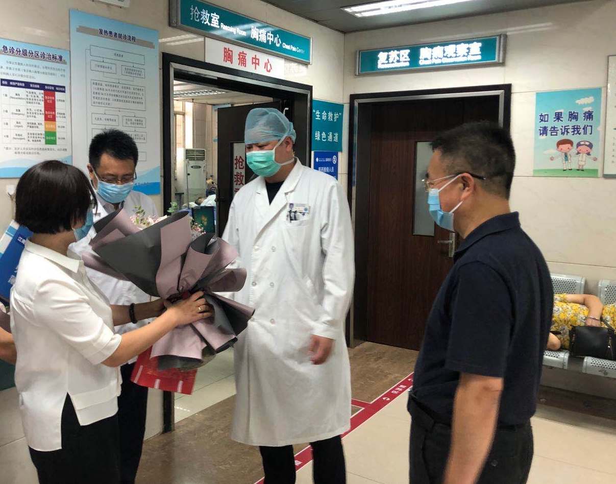 领导一行走访了附院预检分疹处、急诊科,向在高温下仍然坚守岗位、救死扶伤的医生们致以节日的祝福和诚挚的问候,并向医生代表献上了鲜花。
