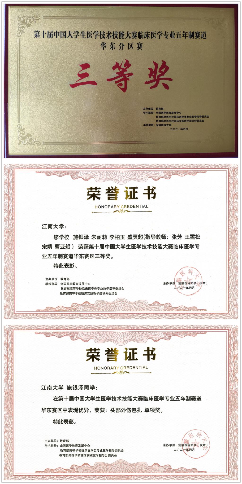 2021年4月10日至11日,第十届中国大学生医学技术技能大赛临床医学专业五年制赛道华东分区赛在安徽合肥顺利举行,江南大学代表队以优异表现在46支队伍中脱颖而出,荣获团队三等奖及“头部外伤包扎”单项奖。