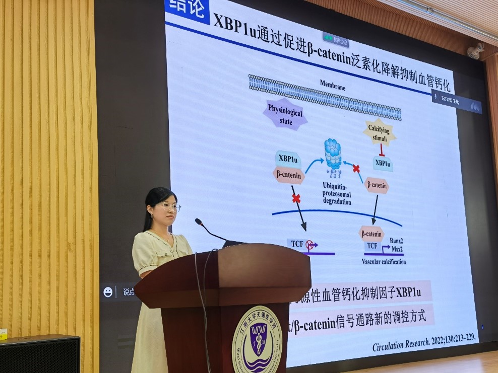 随后,主讲人杨柳开始了主题为《非剪接型XBP1通过促进β-catenin降解抑制血管钙化》学术演讲,生动形象的展示了杨柳老师在北京大学读博期间做的研究,分享了相关工作。汇报结束后,马鑫院长首先提出问题与主讲人进行深入交流;随后,一些教师和2022级博士刘良举先后提出问题并与主讲人进行深入交流,提问人与主讲人均表示通过交流学到了很多知识,拓展了新的研究思路,解决了一些科研难题。会后几位研一新生与主讲人进行了深入探讨,几位同学均表示对主讲人的研究领域感兴趣,希望深入了解。