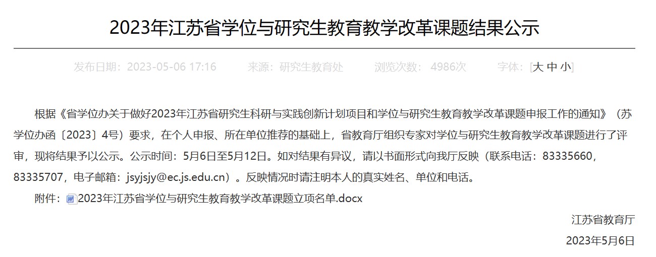 江苏省学位与研究生教育教学改革重点课题立项名单截图