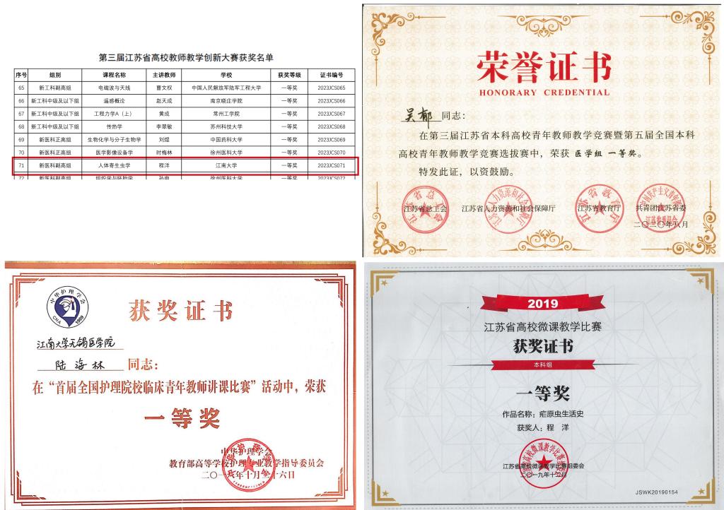 教师在各类教学比赛中屡获佳绩,荣获全国护理院校临床青年教师讲课比赛一等奖1项、全国医学高等院校青年教师教学基本功比赛三等奖1项、江苏省高校教师教学创新大赛一等奖1项、江苏省高校青年教师教学竞赛一等奖2项、二等奖2项、江苏省高校微课教学比赛一等奖1项。