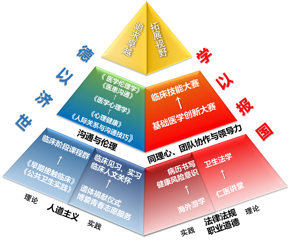紧扣大健康理念,构建递进式医德素质教育模式,强化医学生的职业素养。将社会环境教育前移,遗体捐献、博爱青春等志愿者活动以加强人文和健康科普素养。举办仁医讲堂,邀请自政府、高校、附属医院名家名医来院讲学,引领医学生树立专业自信。重视沟通与伦理能力培养,在基础阶段侧重人际交流能力,在临床阶段以医患沟通实践为主。海外访学、知名医院观摩交流、全球卫生概论以拓展其大健康、大卫生的全球视野。基础医学实验创新竞赛、临床技能竞赛活动将专业教育和素质教育交融渗透。