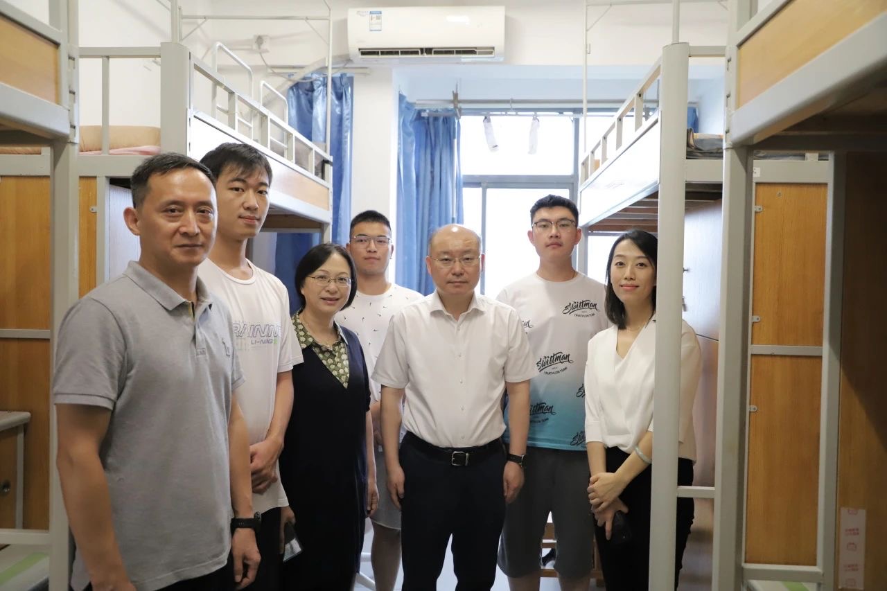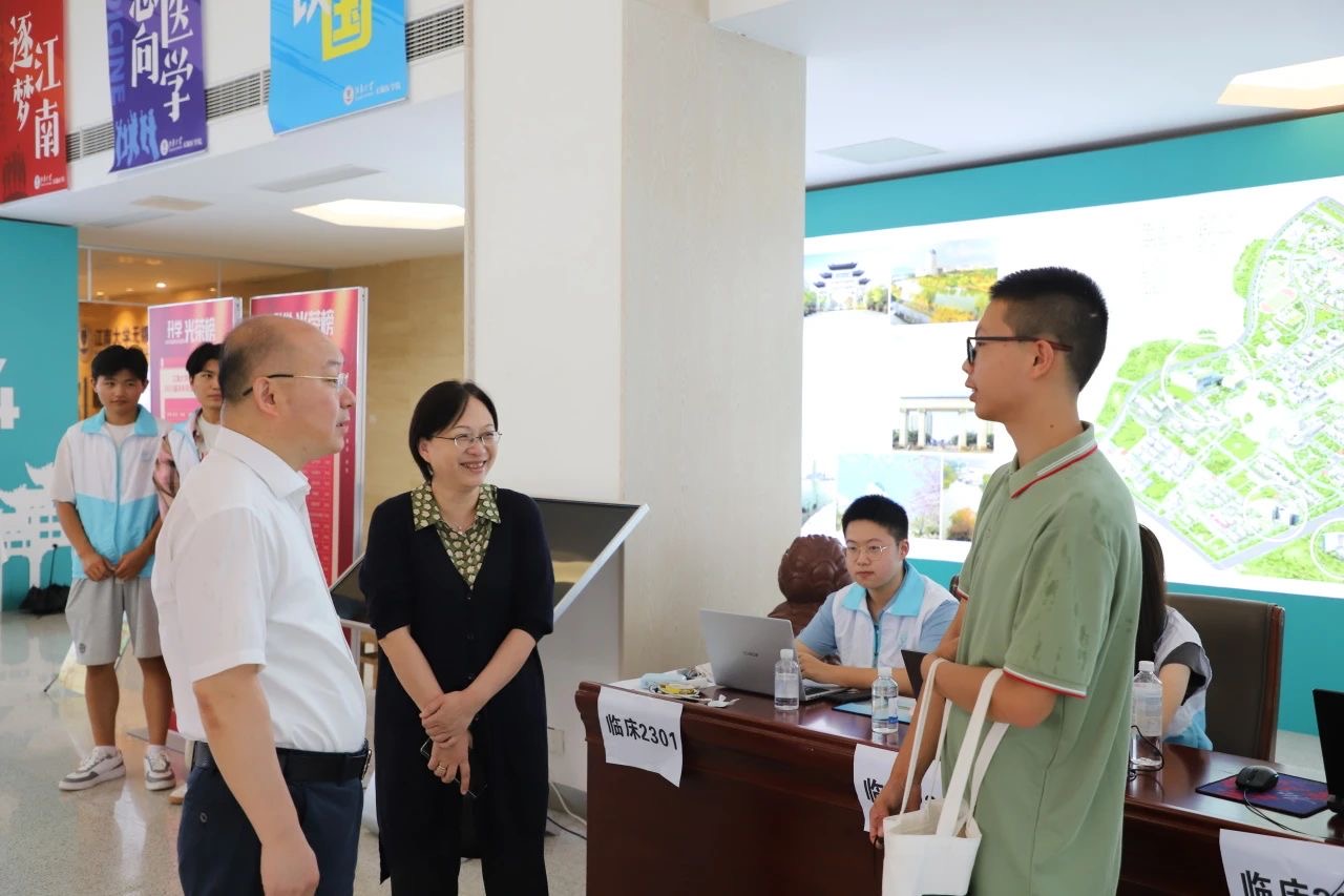 教授黄亿、韩甦和辅导员李奈夏、鲁钦正老师等亲临报到现场,并走访新生宿舍,亲切慰问新生入学情况。“同学,你来自哪里?”“对宿舍还满意吗?”“为什么选择学医,是家里也有亲人学医吗?”领导们与新生亲切交流,并对不同学科专业的学生均给予了有针对性的科研学习建议,鼓励同学们要学会利用学院和医院双平台,做好学习规划,加强科研攻关,以积极的心态迎接大学生活,在崭新的医学道路上行稳致远。