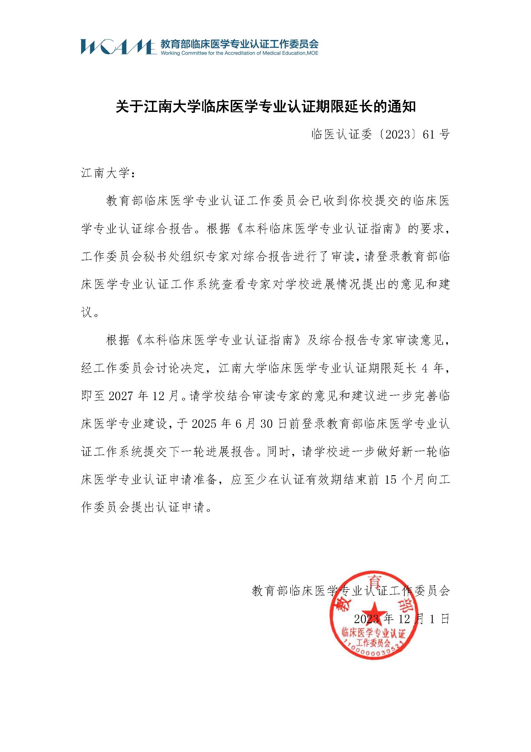 近日,教育部临床医学专业认证工作委员会向我校下达了《关于江南大学临床医学专业认证期限延长的通知》,明确我校临床医学专业认证期限延长4年,总期限达8年,即至2027年12月。