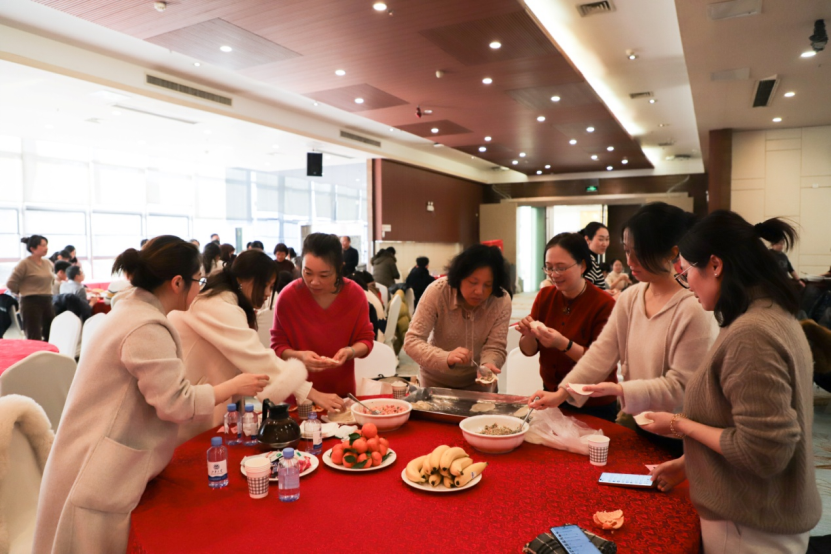 在长广溪宾馆一楼大厅,老师们参与了新春猜谜游戏,进行了包饺子活动,大家默契配合、忙得不亦乐乎,不一会,一个个圆滚滚、白胖胖的饺子整齐地排在餐盘中,现场气氛尤为温馨快乐、一片欢声笑语。在等待饺子下锅蒸煮的同时,九博国际