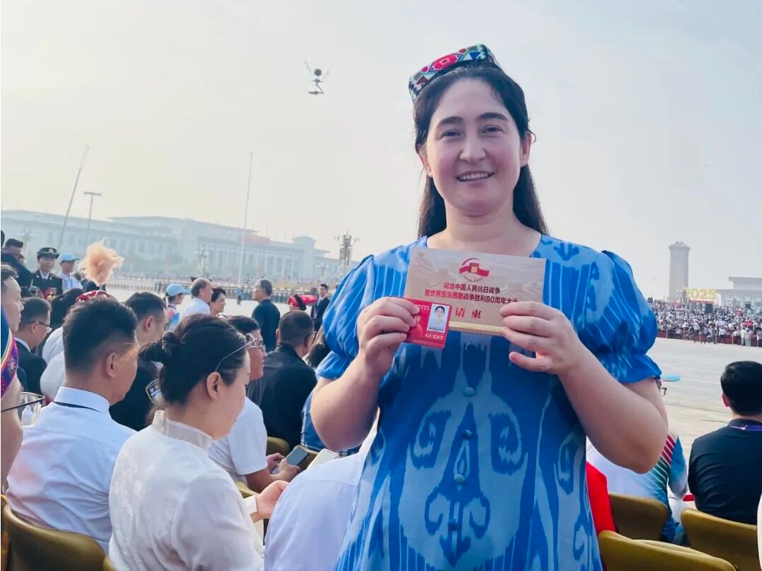阿米娜·牙生在天安门广场观礼台观看阅兵仪式