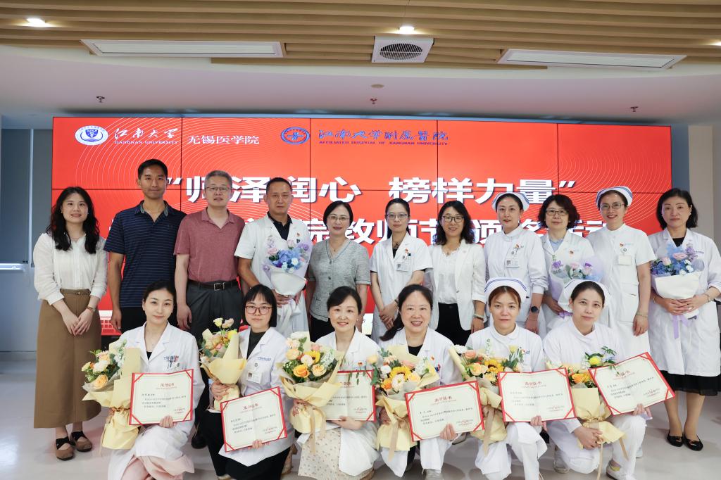 教师节颁奖活动。党委书记向琪、执行院长孙宁为叶超、吴国胜、蒋玉宇颁发“优秀教师”荣誉称号;院党委副书记、副院长包羽,院长助理刘赟为孙海建、陈建欢、王佩雯、叶超、吴国胜、刘焕良、乔晨萌颁发“优秀科创指导教师”荣誉称号。副院长代卉、陈雪为葛雨秋、赵鹏颁发“优秀班主任”荣誉称号;副院长赵鹏为胡晓丹、周祎瑶颁发“优秀辅导员”荣誉称号。当日,学院领导一行前往江南大学附属医院慰问医院教师。院党委书记向琪,执行院长孙宁,副院长代卉,院长助理刘赟为杨文霞、陈思敏、芦慧颁发“优秀临床带教老师”荣誉称号,为胡雯晴、王元、童晓颁发“优秀教师”荣誉称号。