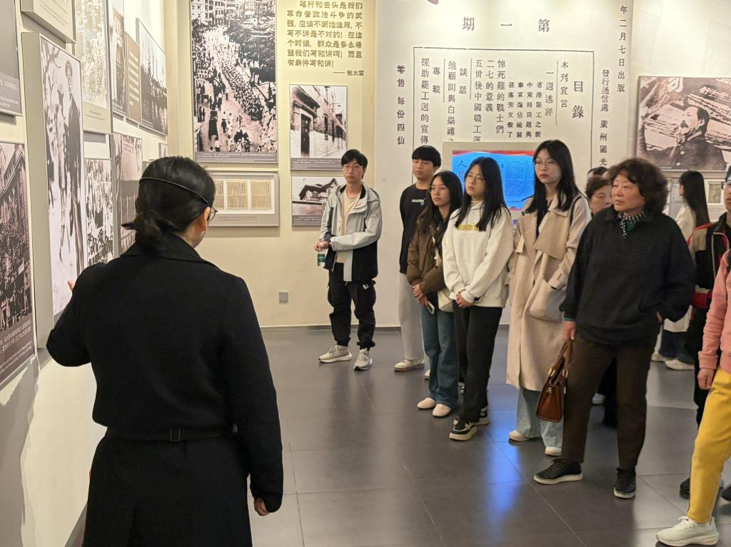 来到“广州起义”展区,讲解员为师生沉重叙述,1927年12月11日,张太雷任广州起义总指挥,率部攻占公安局,竖起“广州苏维埃”红旗,翌日赴前线途中遭敌伏击,壮烈牺牲,年仅29岁,成为第一位战死火线的中央政治局成员。师生们在沉重的氛围中汲取力量,内化为坚定党的道路的决心。