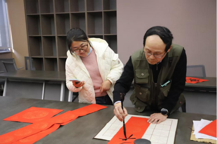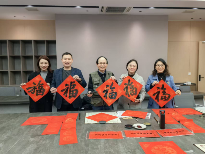 随后的“墨香迎福”写春联送福字环节,现场邀请了江南大学宣传部胡奕老师和有书法功底的同学担任“送福使者”,研磨挥毫,笔走龙蛇间,一幅幅寓意吉祥的春联、一个个饱满灵动的“福”字跃然纸上,老师们或驻足围观,或亲自提笔尝试,墨香氤氲中,大家互相切磋笔法、分享年味,一张张红纸承载着真挚的祝福,传递着同事间的深厚情谊。