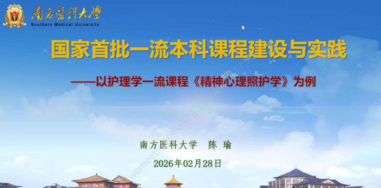 为扎实推进我院护理学专业认证后的持续改进工作,精准对焦课程建设薄弱环节,切实提升人才培养质量,我院特邀南方医科大学护理学院教授、博士生导师、国家首批课程思政教学名师陈瑜教授于2026年2月28日下午15:00做线上专题讲座,题为国家首批一流本科课程建设与实践——以护理学一流课程《精神心理照护学》为例。会议由护理系主任蒋玉宇老师主持,护理系全体教师、各附属医院临床带教负责人及教学管理人员,共计120余人,共同参会学习。