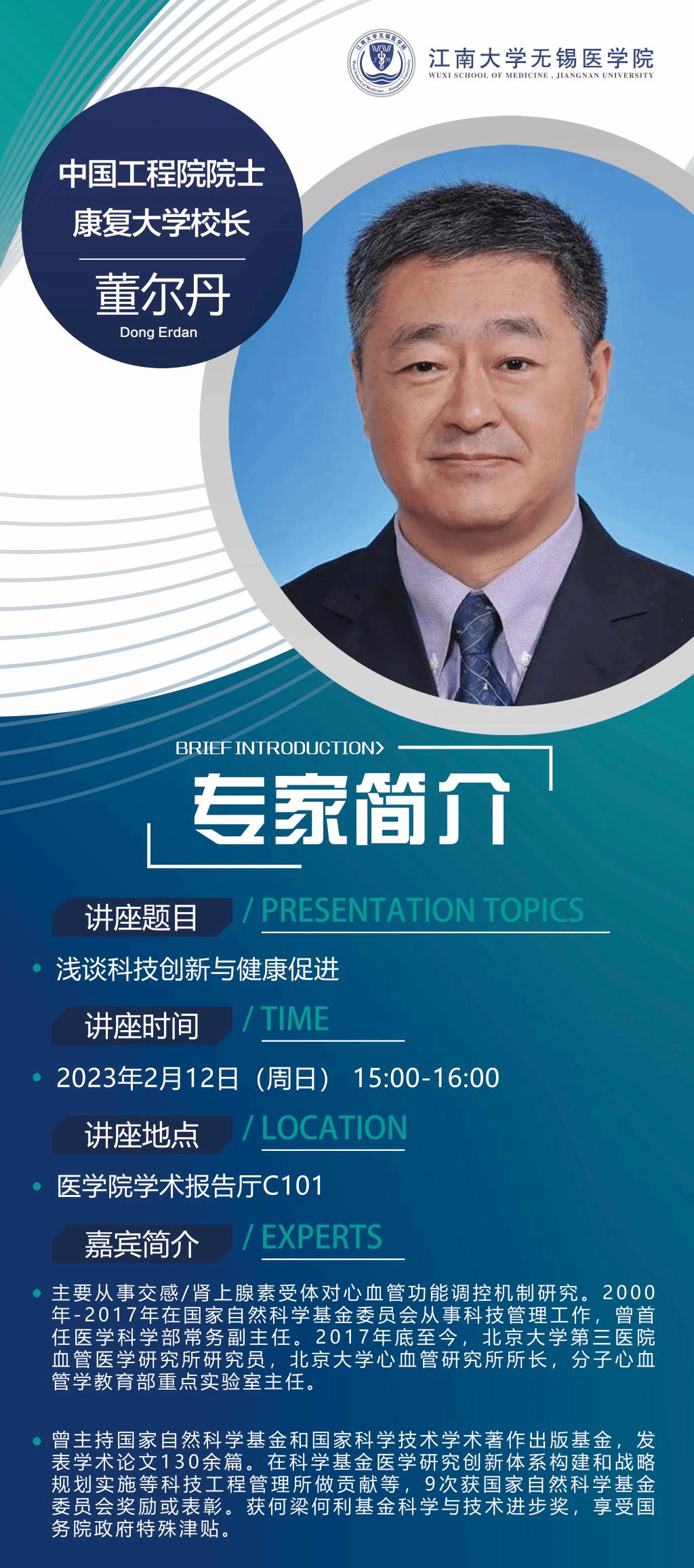 2月12日九博国际-九博体育 前沿学术论坛第十二讲 董尔丹院士——浅谈科技创新与健康促进