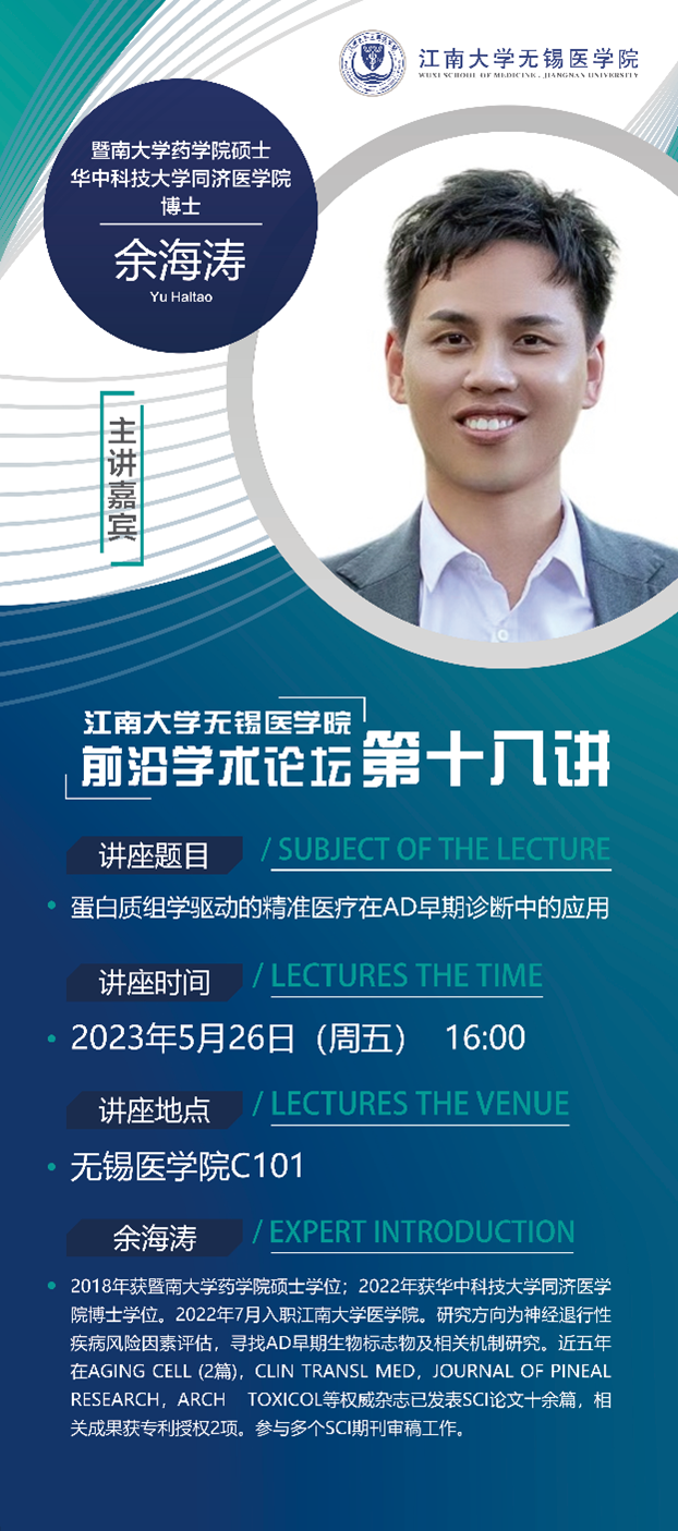 5月25日九博国际-九博体育 前沿学术论坛第十八讲 余海涛副教授——蛋白质组学驱动的精准医疗在AD早期诊断中的应用