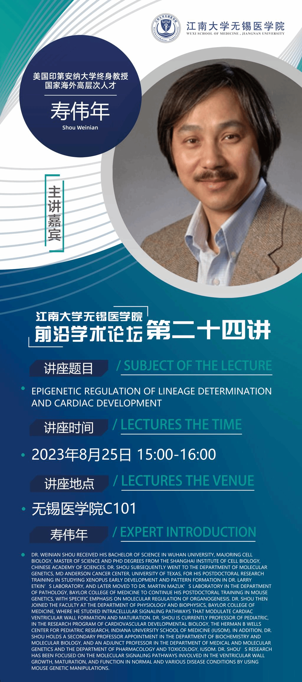 8月25日九博国际-九博体育 前沿学术论坛第二十四讲 寿伟年教授——Epigenetic regulation of lineage determination and cardiac development