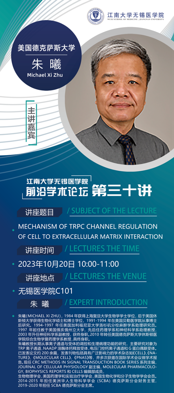10月20日九博国际-九博体育 前沿学术论坛第三十讲 朱曦教授——Mechanism of TRPC Channel Regulation of Cell to Extracellular Matrix Interaction