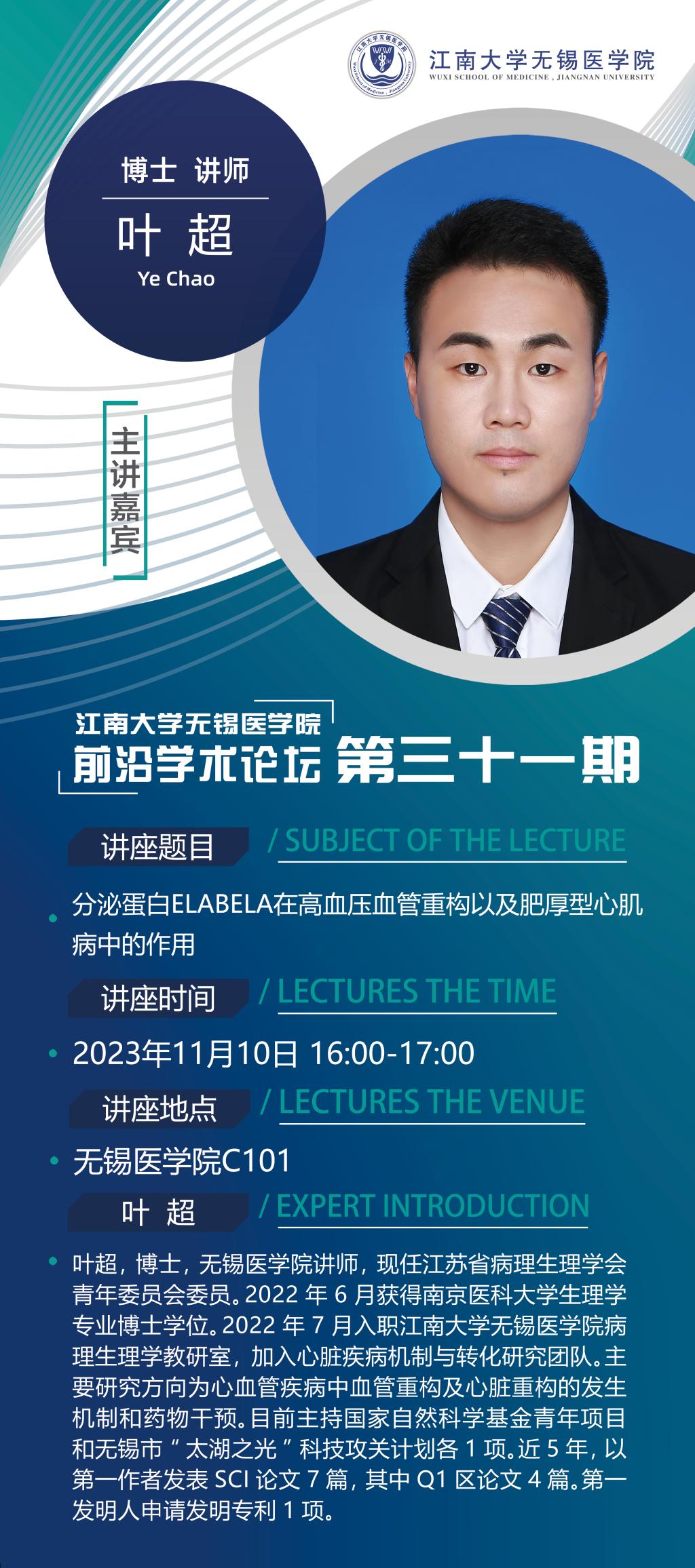 11月10日九博国际-九博体育 前沿学术论坛第三十一讲 叶超老师——分泌蛋白ELABELA在高血压血管重构以及肥厚型心肌病中的作用
