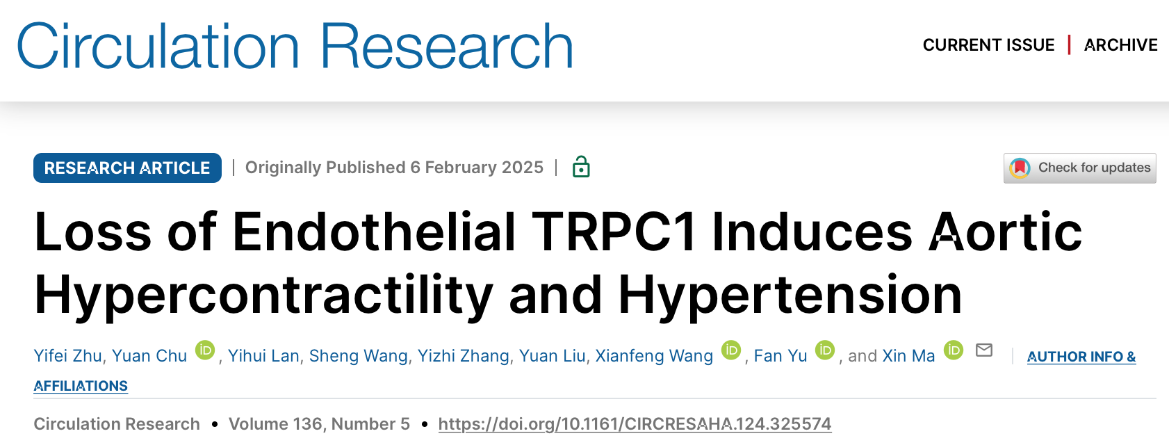 2025年2月6日,江南大学马鑫团队在Circulation Research(IF=16.5)在线发表题为“Loss of Endothelial TRPC1 Induces Aortic Hypercontractility and Hypertension”的研究论文,该研究表明内皮细胞TRPC1缺失诱导主动脉收缩过度和高血压。