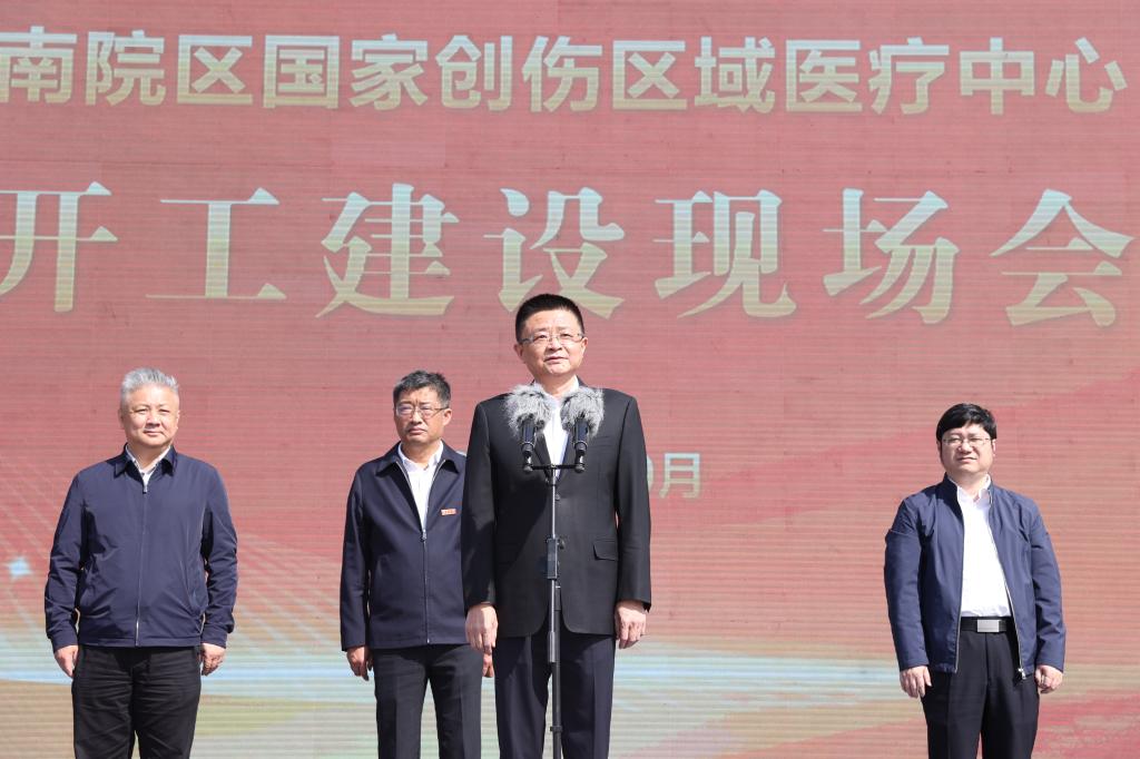 无锡市人民政府副市长秦咏薪讲话,并宣布“江南大学附属医院南院区国家创伤区域医疗中心(原烧伤楼)建设项目开工”。