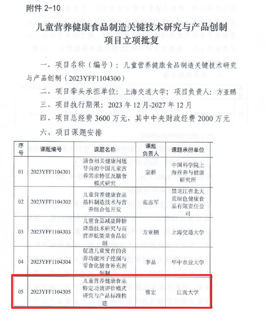 近日,我院曹宏教授张烽教授团队参与申报的“十四五”国家重点研发计划项目“儿童营养健康食品制造关键技术研究与产品创制”成功获批立项,该项目由上海交通大学牵头,项目总经费3600万元,其中中央财政专项资金资助2000万元。曹宏教授作为课题五负责人主持“儿童营养健康食品特定功效评价模式研究与产品标准构建”,团队成员李丹博士、闫继爱博士和孙静博士分别作为子课题负责人参与该项目中。这是继2022年张烽教授作为子课题负责人参与国家重点研发计划“特定疾病状态人群特殊医学用途配方食品创制”后,营养科团队取得的又一突破性成果。
