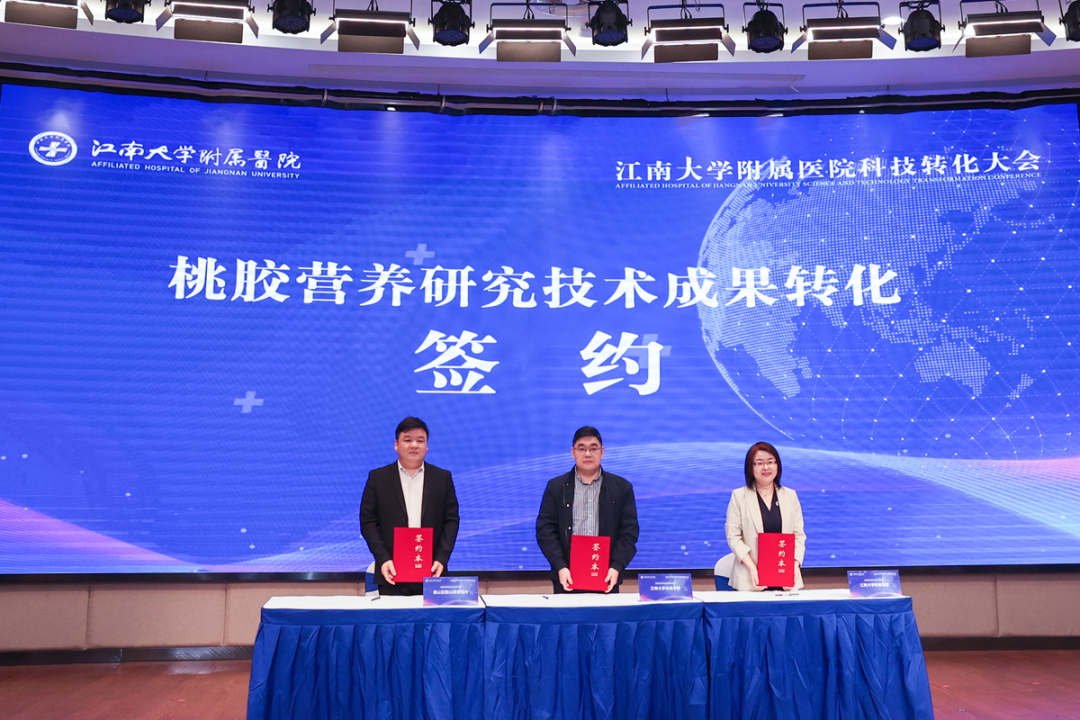 江南大学附属医院副院长曹宏,江南大学食品学院副院长赵伟,惠山区阳山镇普照村党总支书记、村委会主任杨一飞进行桃胶营养研究技术成果转化签约。