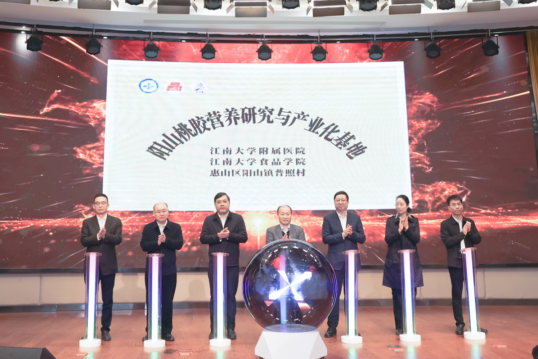 江南大学副校长顾正彪,市委组织部常务副部长戴美忠,市卫生健康委党委书记、主任笪学荣,江南大学食品学院党委书记傅莉莉,江南大学附属医院党委书记过栋,惠山区委常委、组织部部长吴波,阳山生态休闲旅游度假区党工委书记、管理办公室主任、阳山镇党委书记许彤亮共同为“桃胶营养研究与产业化基地”揭牌。