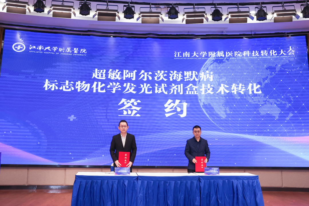 江南大学附属医院韩霜,江苏泽成生物技术有限公司副总经理夏振伟进行超敏阿尔茨海默病标志物化学发光试剂盒技术转化签约。